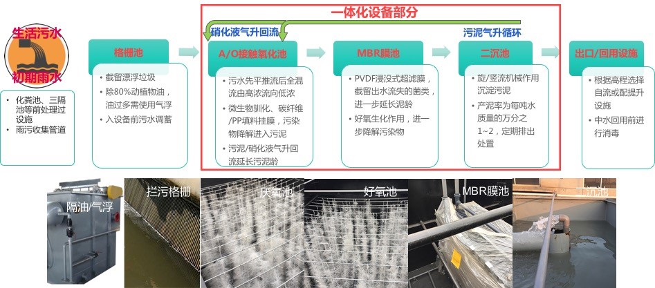 “气升回流一体化污水处理技术”是一种利用曝气冲刷作用实现污泥在反应器中的自动循环的低能耗水处理新技术。该技术以常用的厌氧-好氧生化法(A/O)为基础,采用气升回流技术、膜过滤技术以及碳纳米纤维填料技术组合而成,属于一体化污水处理技术。气升回流一体化污水处理设备主体包括格栅隔油池、厌氧反应池、好氧反应池、MBR膜池/二沉池及配套的前处理、收集和回用设施等,设备具有模块化、小型化、自动化的技术特点。污水通过该设备的集成处理,能够实现一步到位的达标排放。为城、乡、镇、村不同区域的分散式污水提供紧凑、便捷、高效、低耗的一体化污水处理设备。该工艺包含三大核心单元技术:A/O接触氧化技术、气升回流技术和纳米碳纤维填料技术。